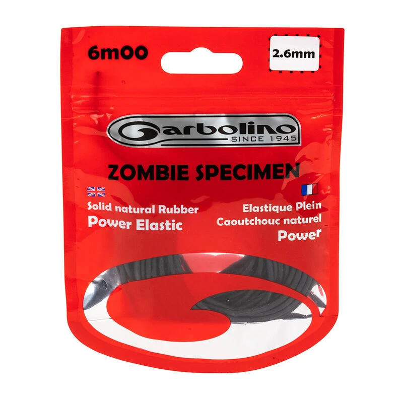 Elastique plein Garbolino de gros diamètre pour la pêche des carpes, des esturgeons et des silures. Les élastiques Zombie Spécimen sont réalisés en gomme Power afin de contrer les rushs des poissons les plus combatifs. Bobine de 6m Caoutchouc naturel Elastique plein Power